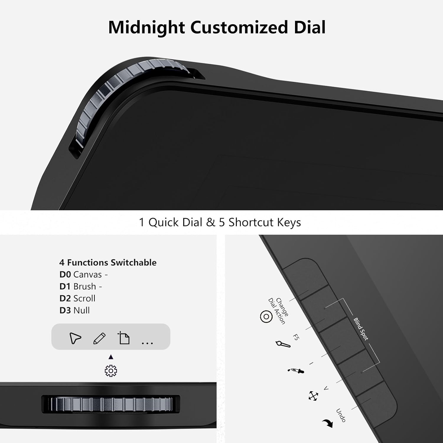 - 【Space-Grade Aluminium Quick Dial 】 Crafted from aerospace-grade aluminum with a sleek anodized finish, this midnight color dial excels in productivity, durability, and elegance. Rotate the dial and use the 5 customizable shortcut keys for quick adjustments in brush dynamics , image navigation, and so on. Save time with intuitive functions that streamline your creative process