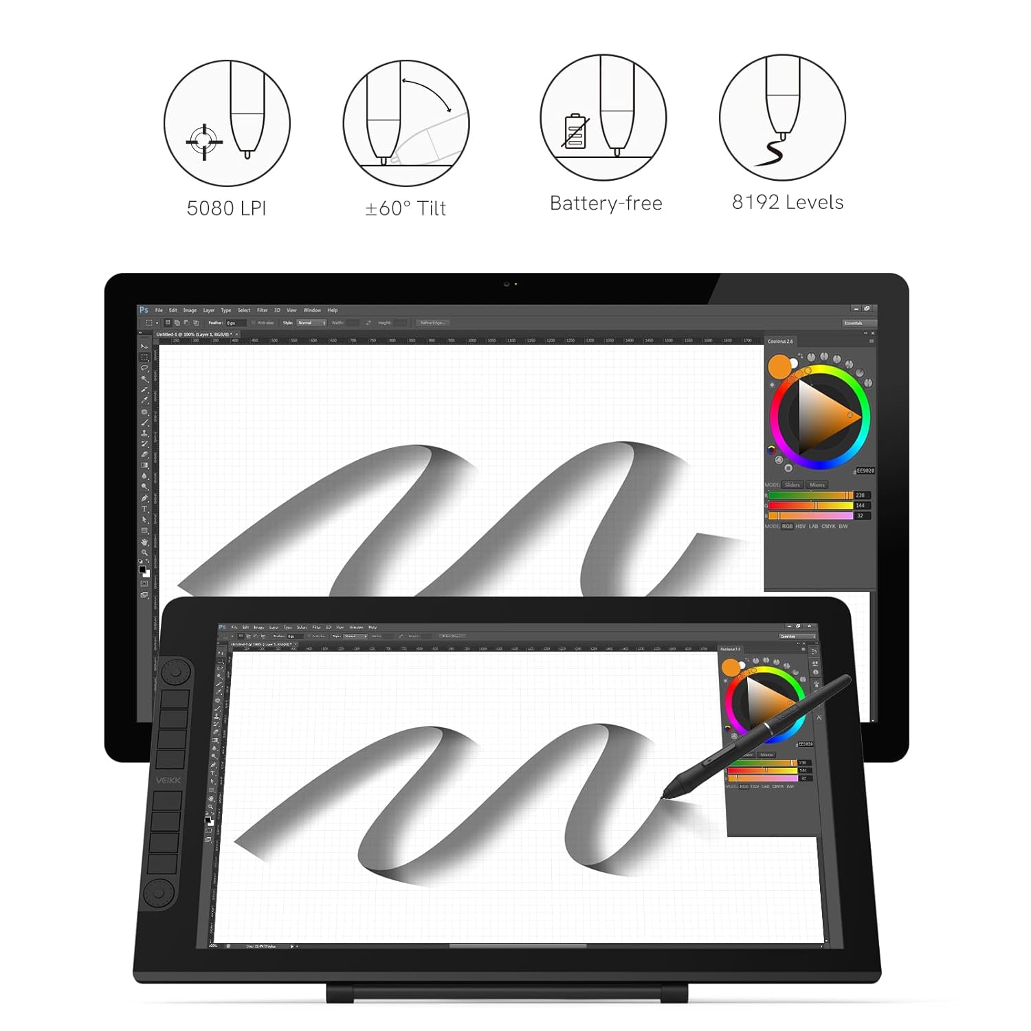 - 【Battery-free Pen and ±60°Tilt surpport】-The VK2200PRO pen display provides 2 P05 battery-free stylus pen,with 8192 levels of pressure sensitivity, ±60°tilt surpport,and 290PPS highest report rate.The pen has no battery and requires no recharging for uninterrupted use.