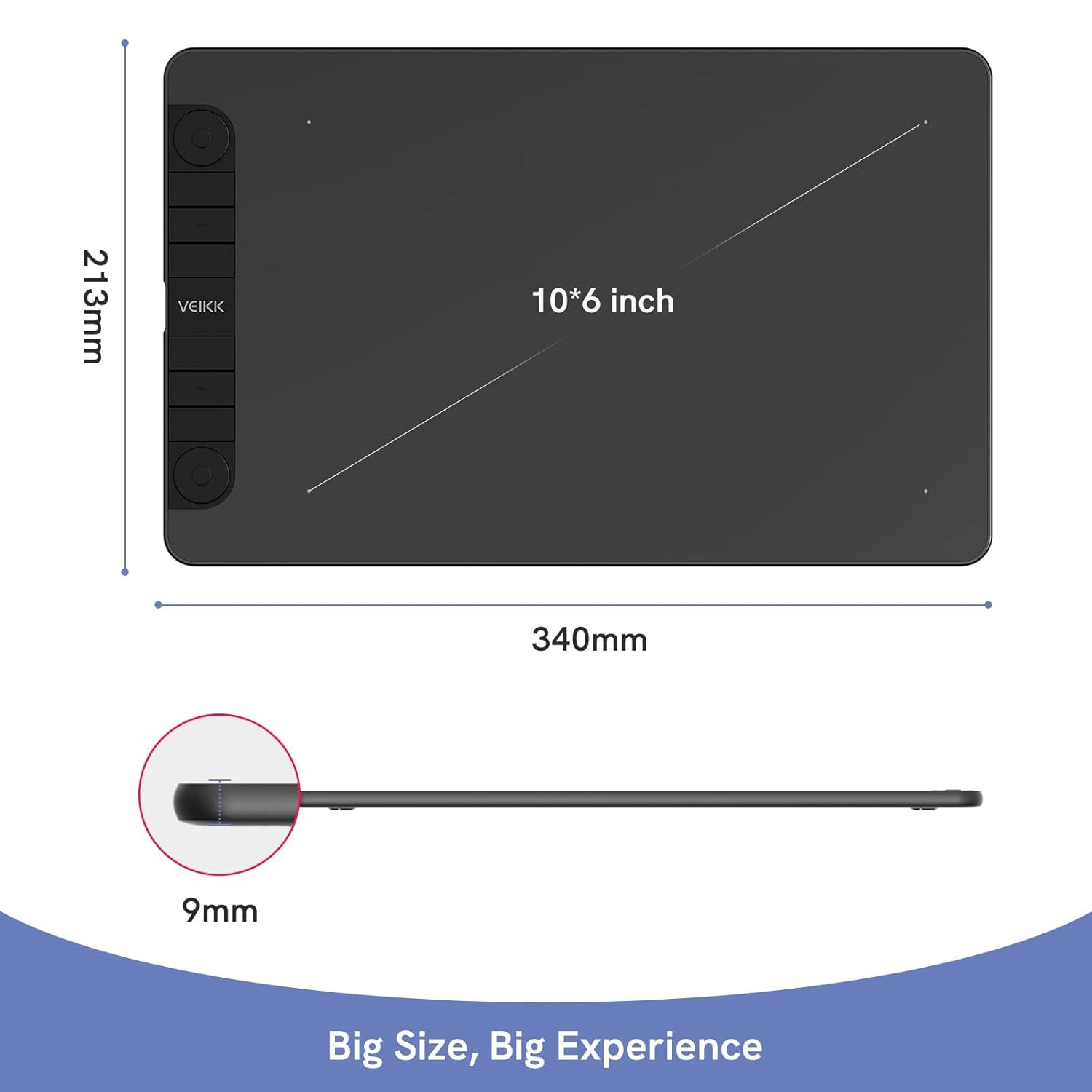• 【Ultra Large Drawing Area】VEIKK VK1060Pro graphics tablet has 10×6 inch large active area, provides enough space for your digital artwork creation. Ultra-thin for only 9mm and light weight body makes it quite convenient and portable. The type-C port on this computer graphics tablets can bring more stable transmission